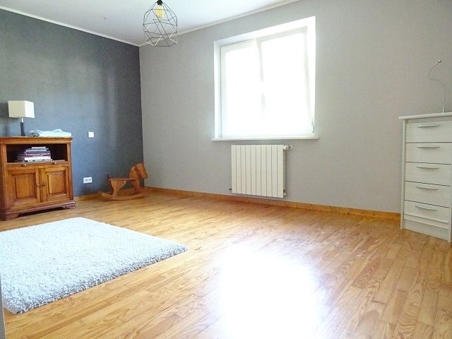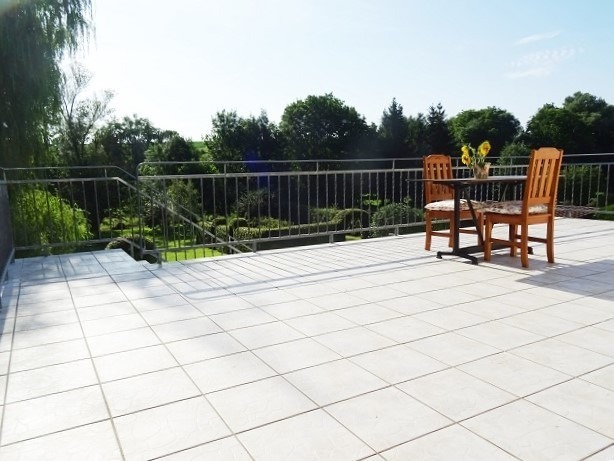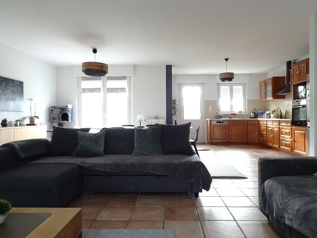Une entrée, un bel espace cuisine équipée ouverte sur le séjour de 54 m2 ( poêle en faïence - kachelofen) avec accès terrasse d'env 45 m2, dégagement, 3 grandes chambres, wc, salle de bains.