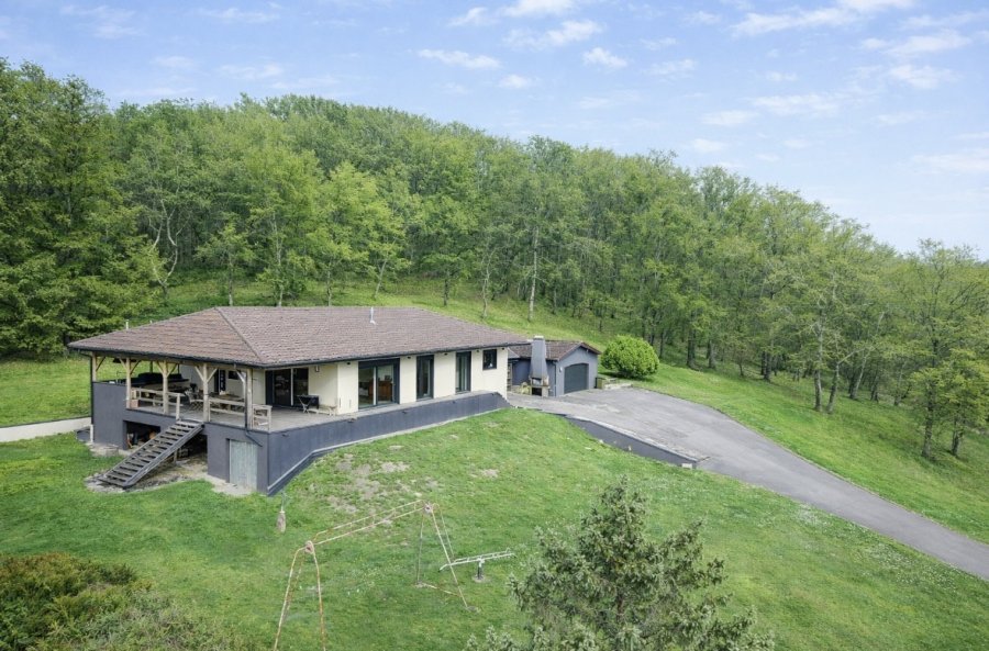 Maison individuelle F6 de plain-pied d'env 170 m2, en ossature bois avec isolation extérieure, édifiée sur un terrain de 51 ares entouré de verdure et de forêt, comprenant:
